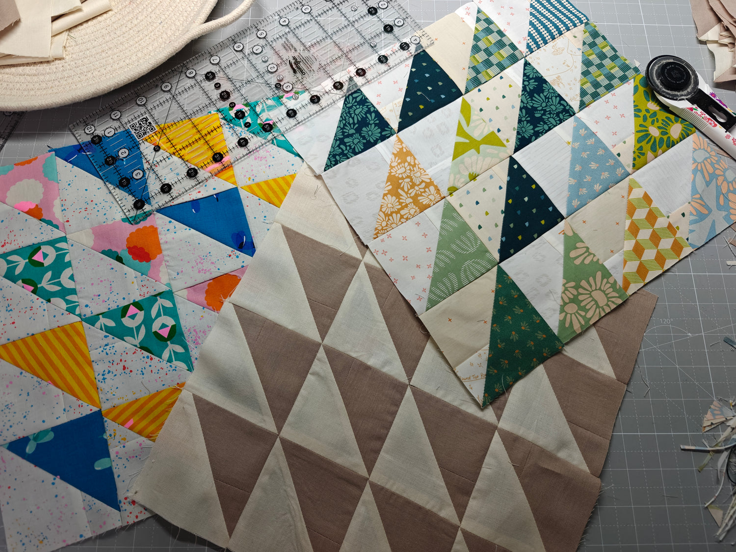 In the Loony pattern, you use a technique called "stitch and flip" or "snowball corners" to create the triangles within the block. When you trim these off, a triangle piece approximately 4" on each side remains from both the feature fabric and the background. These triangles can be used to create half-square-triangle blocks and can be used in a number of other projects. Check them out in the Loony Bonus Project page.
