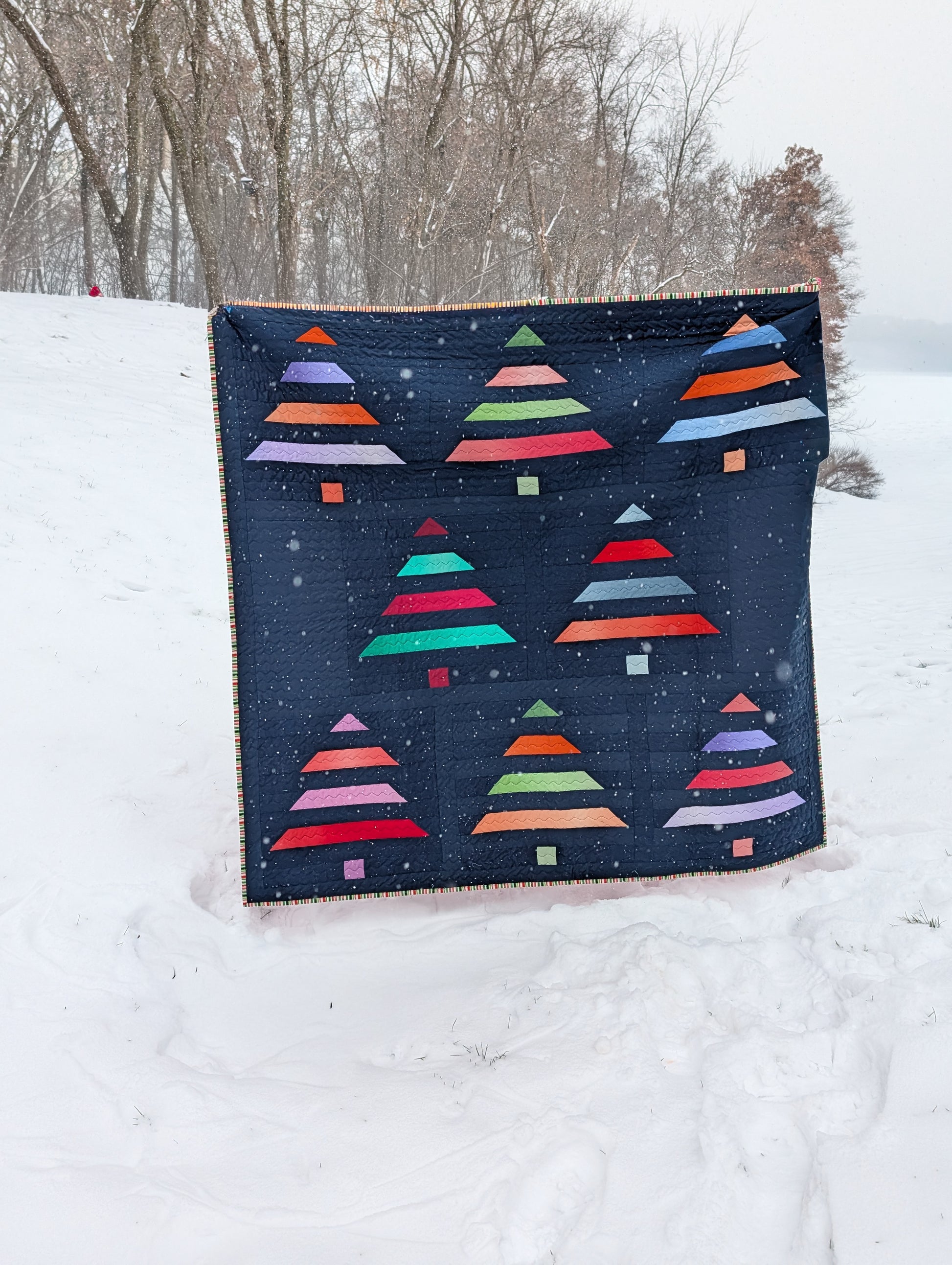 Get festive with this All Spruced Up Quilt! Made from the pattern by Meghan Morris (A piece of quiet quilting), this modern Christmas tree themed quilt adds a touch of holiday cheer to any room. Perfect for snuggling up on the couch, this throw size quilt is both functional and fun. Spruce up your home decor this season!"