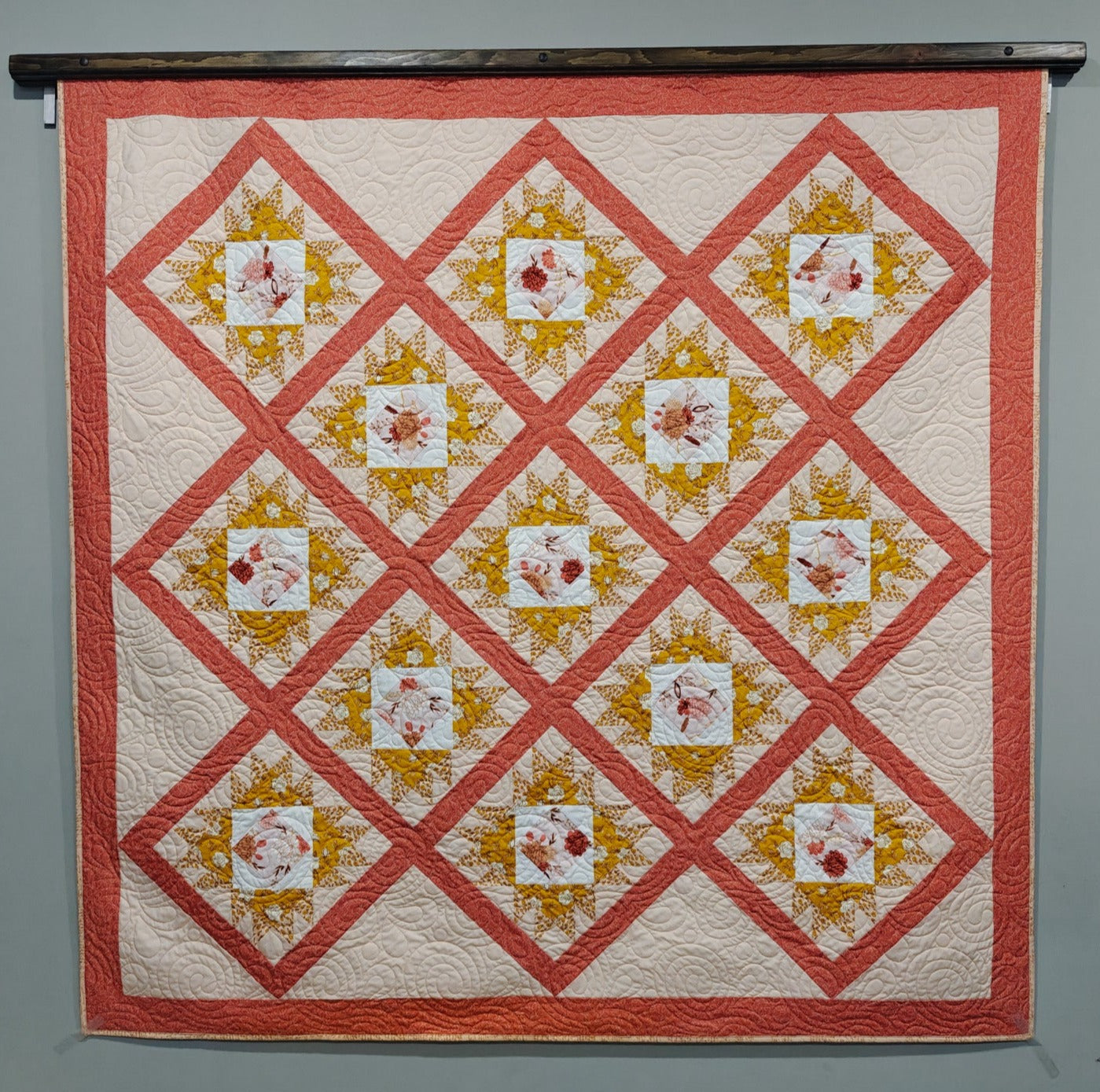 When summer calls, we spend a lot of time exploring outdoors. Inevitably, those little briars and sticky seeds end up all over our clothes and shoes. The block made in this quilt mimics those little spiky bits and calls long summer days outdoors to mind. The blocks are set on point for a visual treat.