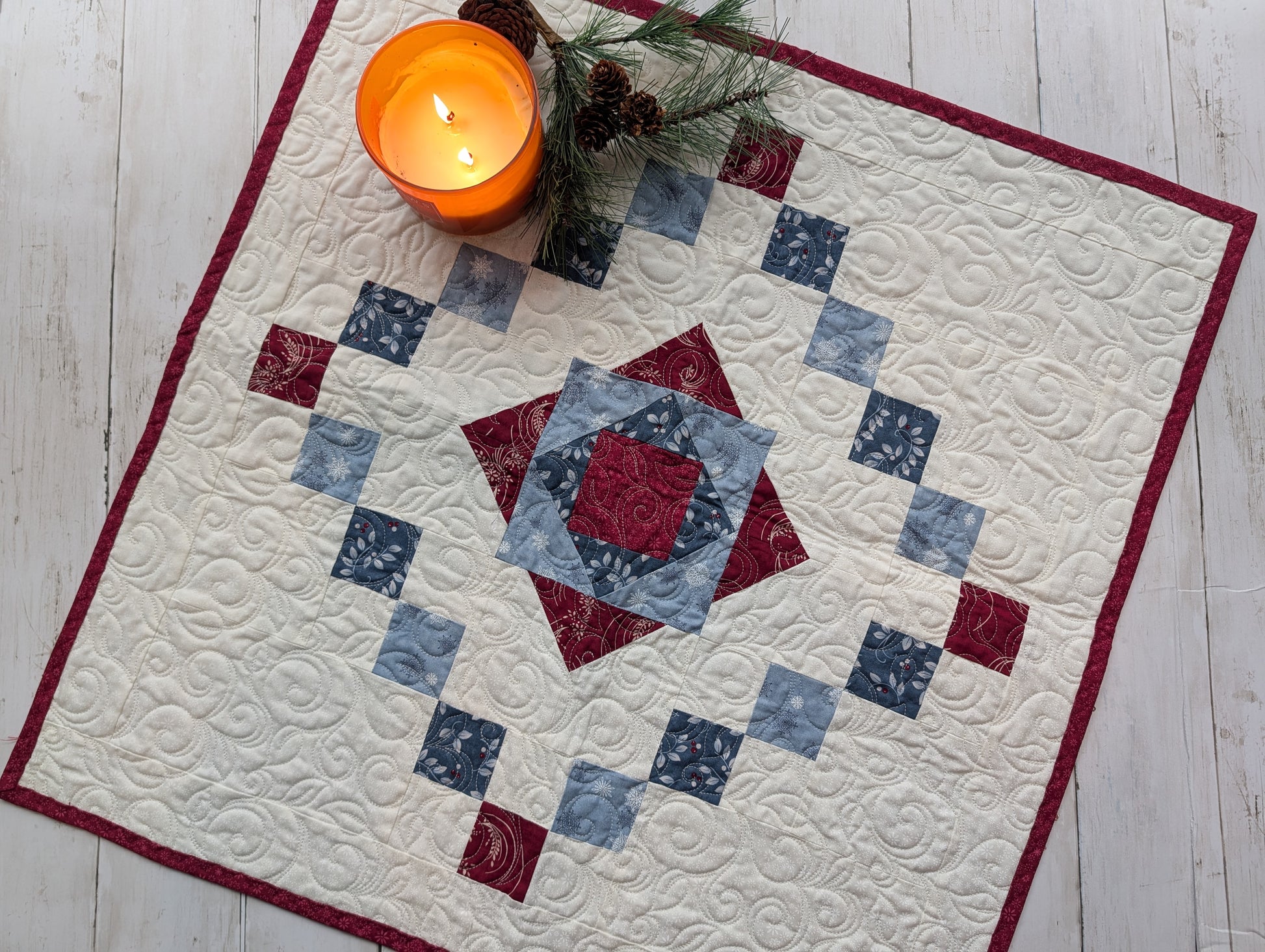 Dress up your home with this quilted table topper. Piece is made from winter blues and cranberry reds with floral and snowflake fabric.