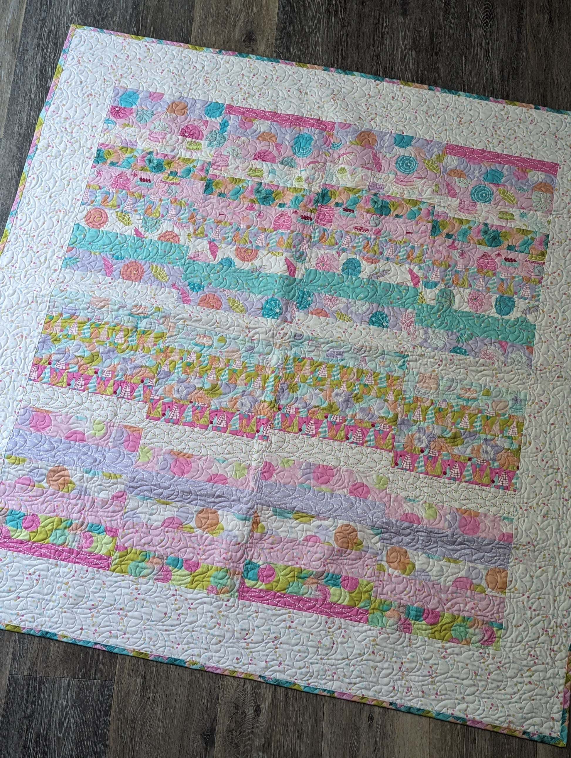 Make your life a party! This fun quilt is made for a soiree with fun party themed fabrics with birthday cakes, party hats and more. Back with a colorful party umbrella print, this quilt will be a joy to snuggle with.