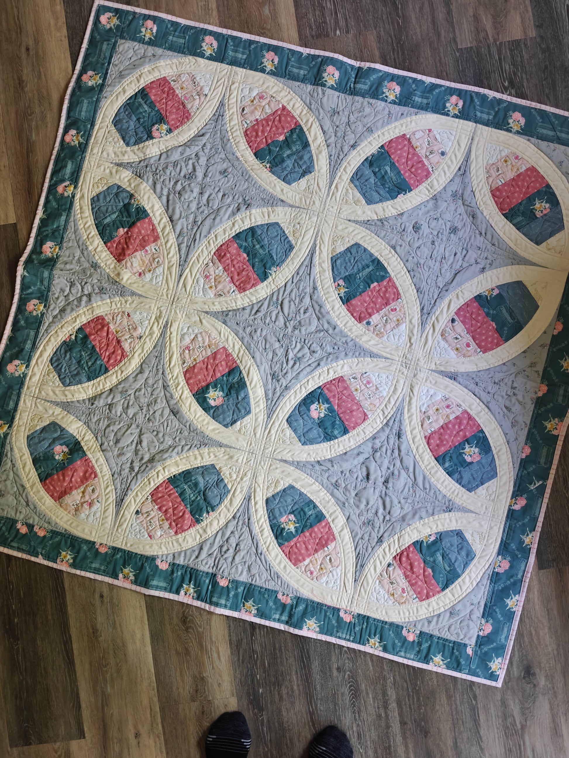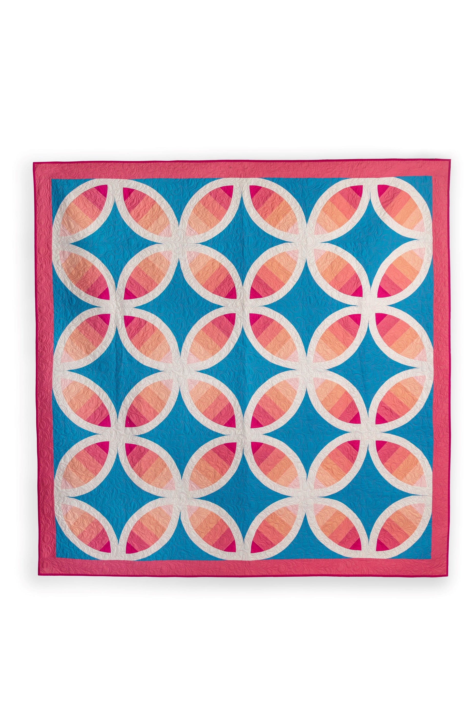 Fairy Rings began as a sketch based on the traditional double wedding rings pattern, inverting the piecing from the rings into the middle. When the blocks are assembled, a secondary design emerges, reminiscent of the wings of a fairy. Thus, Fairy Rings was born as a twist on the traditional pattern.