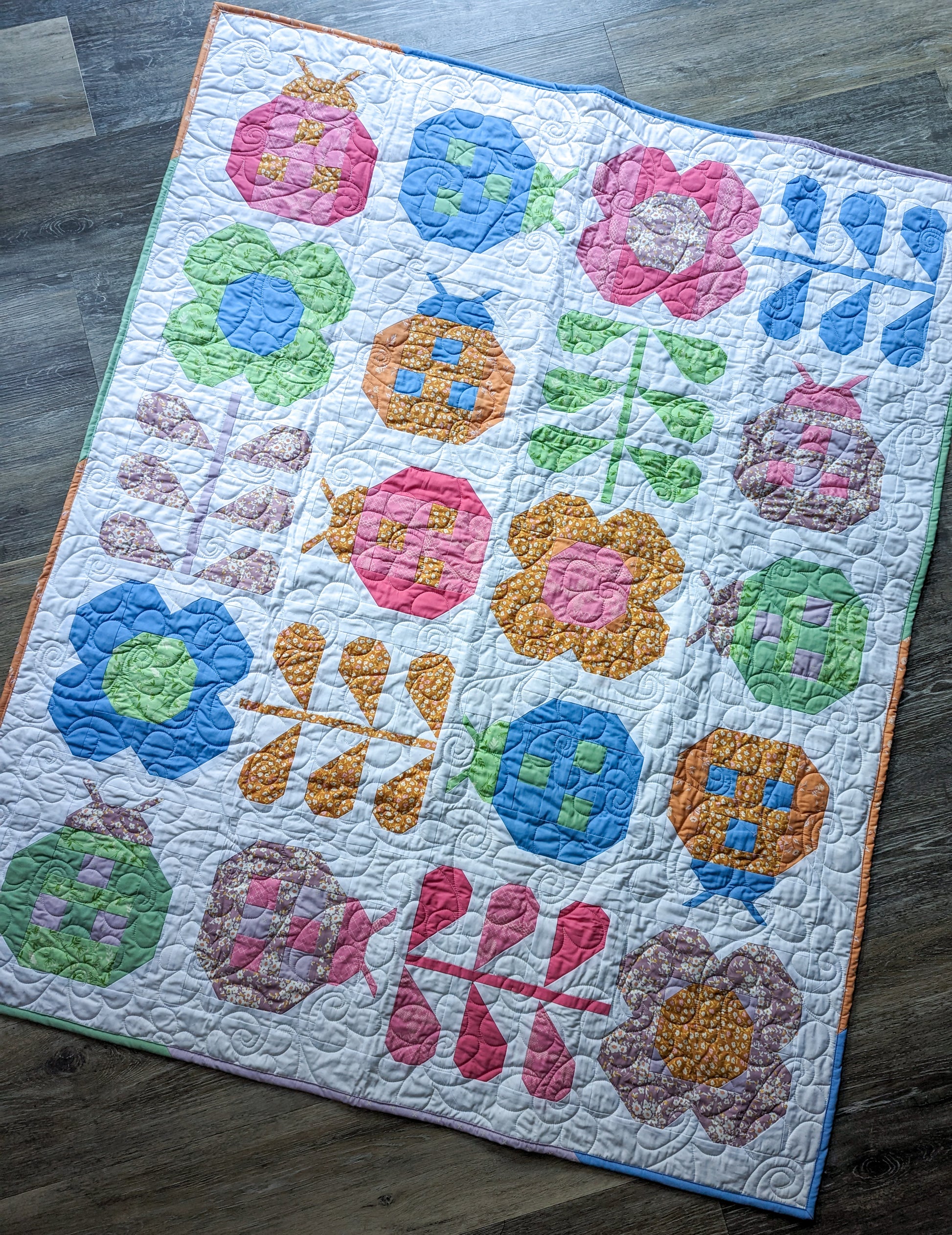 The best parts of spring are the flowers and hunting for insects in the backyard. This lap size quilt (45"x56") embodies the season and is sure to bring a little bit of sunshine to your home.