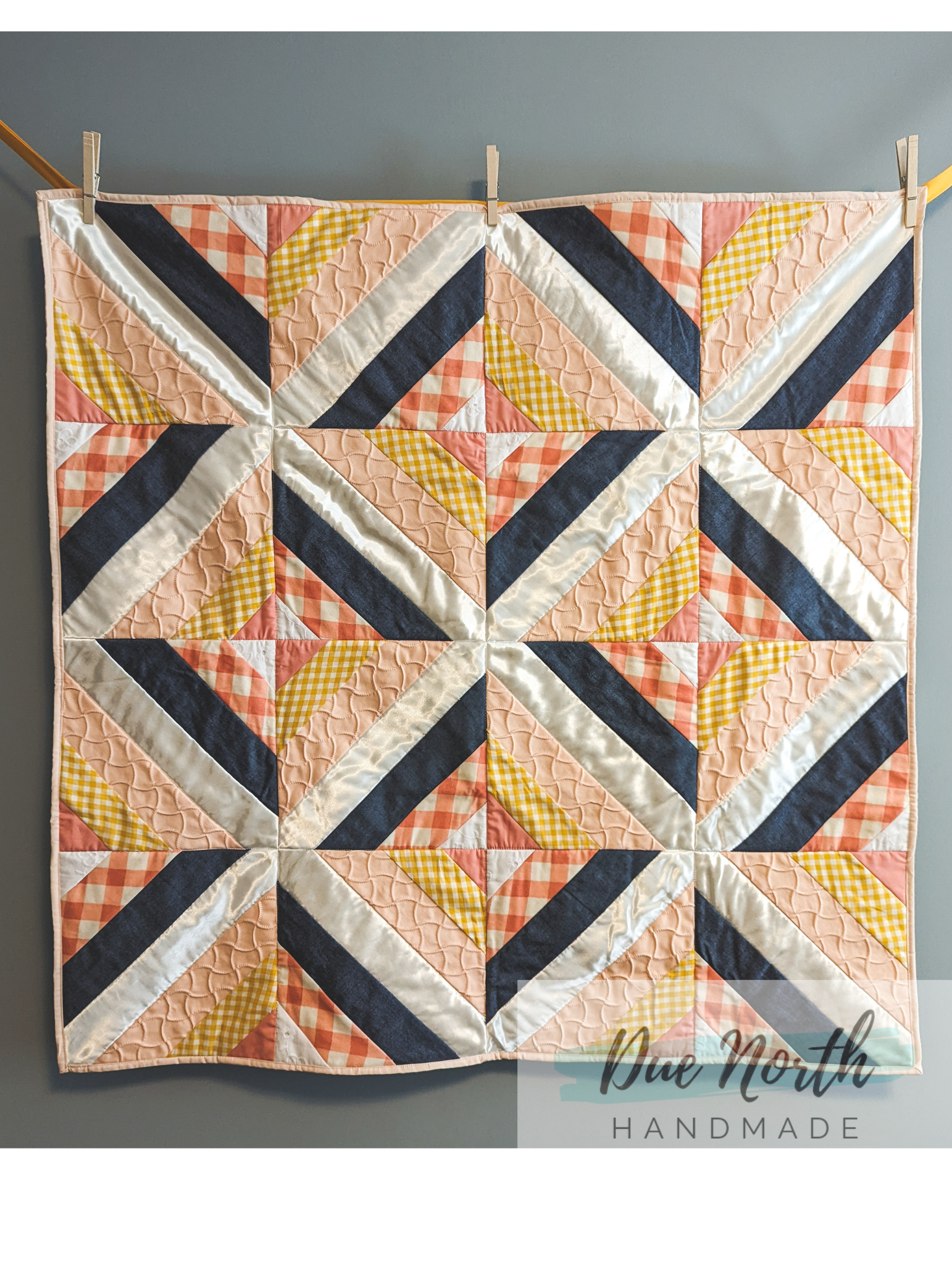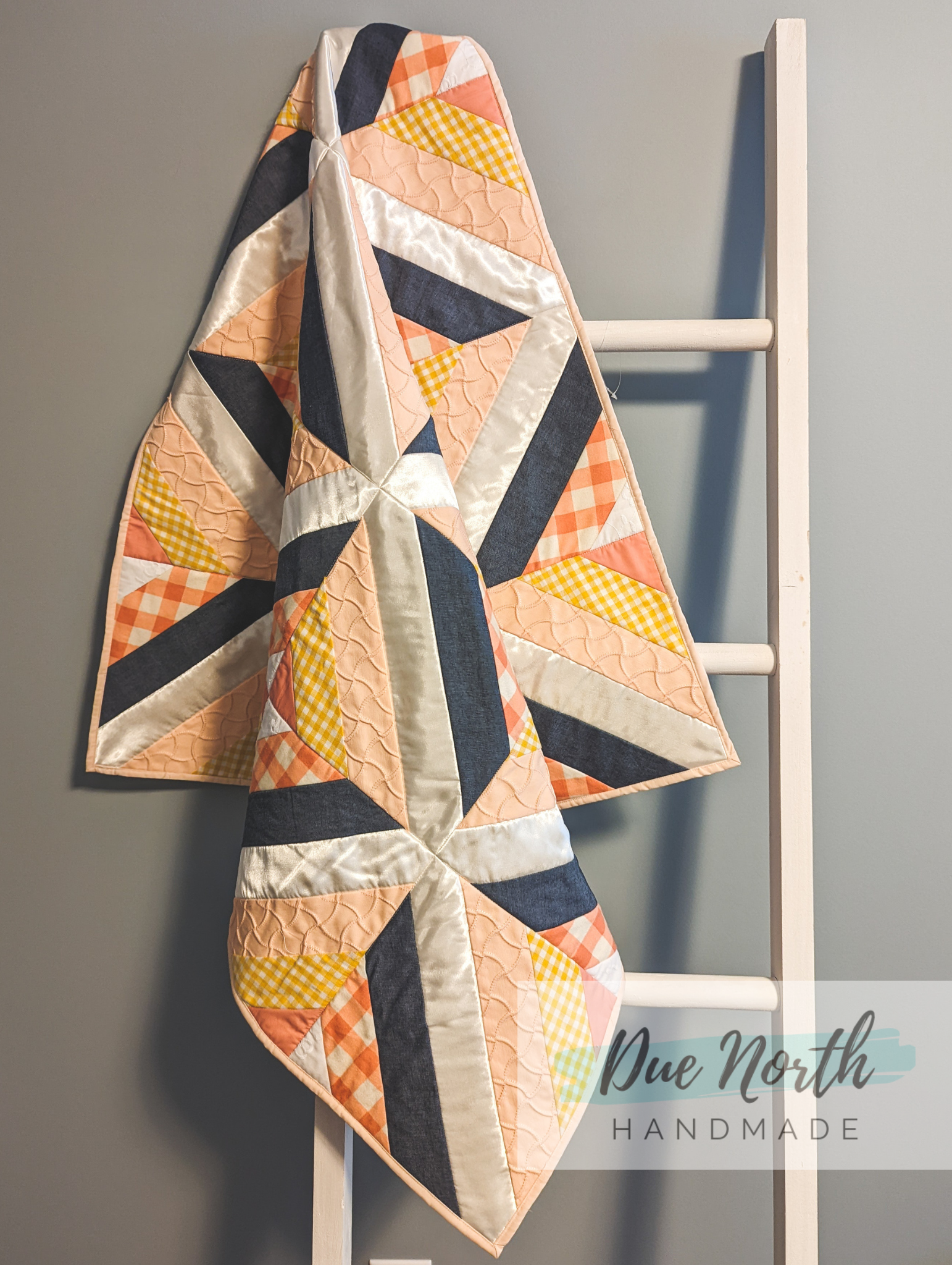 Perfect unique and handmade quilt for your nursery or a one of a kind gift, this Modern baby sized quilt is made with a variety of fabrics for maximum tactile exploration for your little one! This quilt features soft denim, satin, lace, flannel and cotton with a minky back in a variety of blue, peach and golden yellows.
