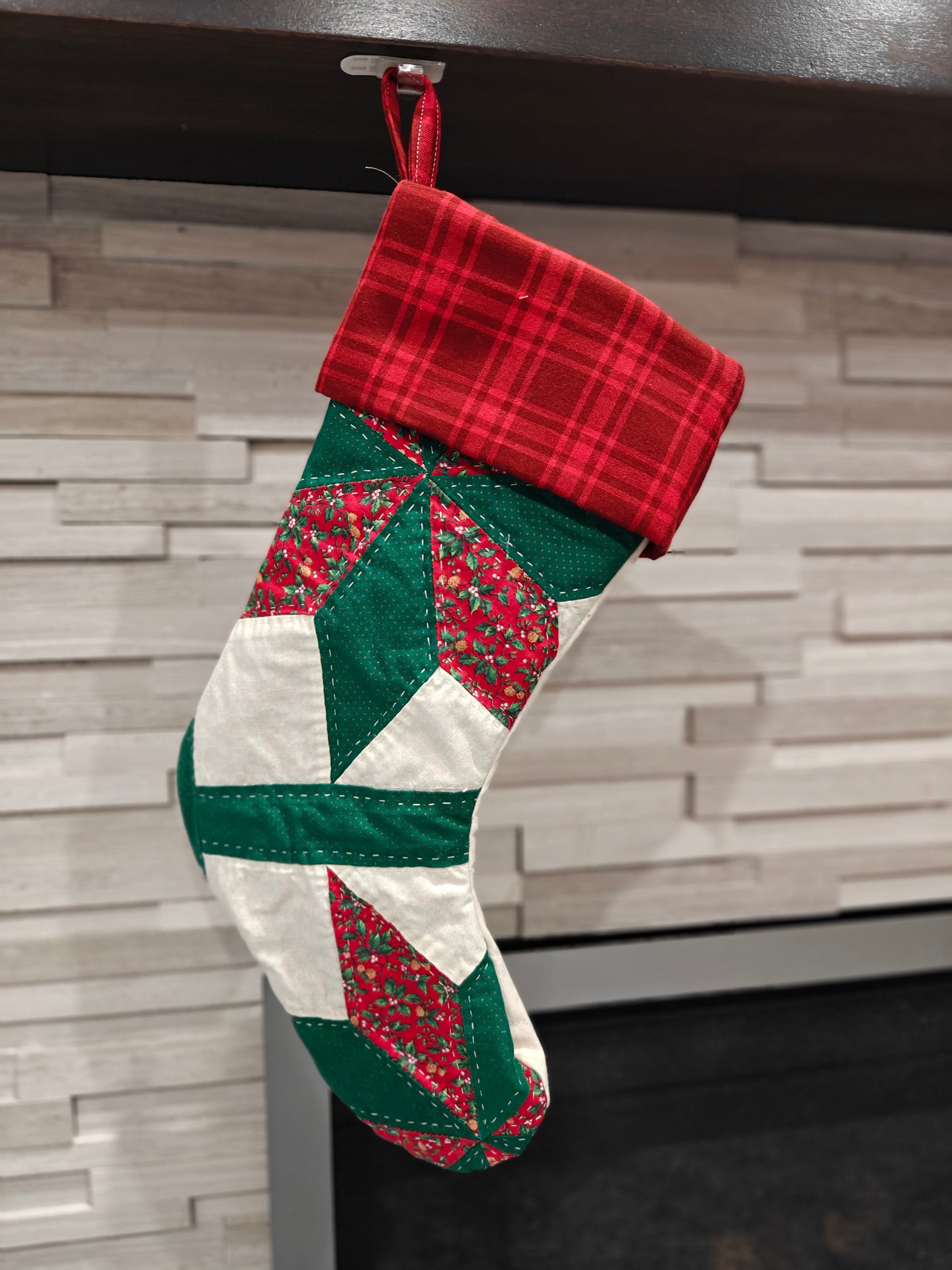 Transform your holiday decor with our Set of 2 Up-cycled Stockings! These one-of-a-kind stockings are made from a vintage quilt, featuring a traditional pattern and hand quilting. Add a touch of nostalgia and sustainability to your Christmas festivities. Only 2 sets available!