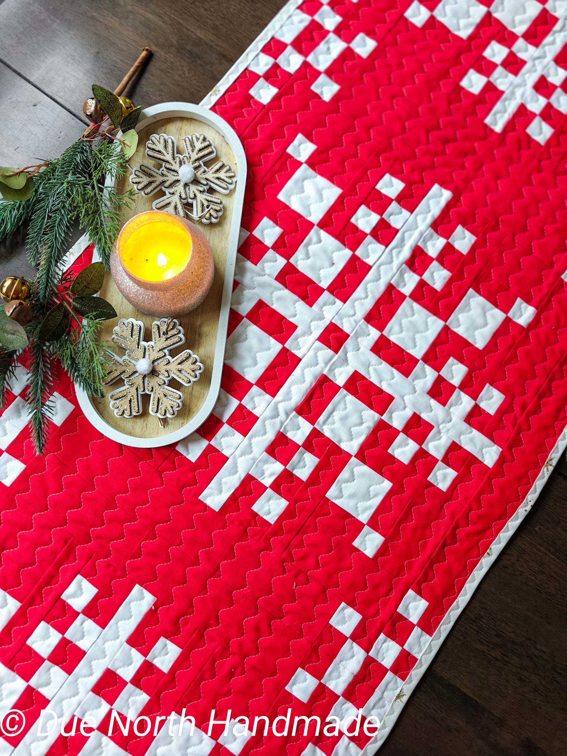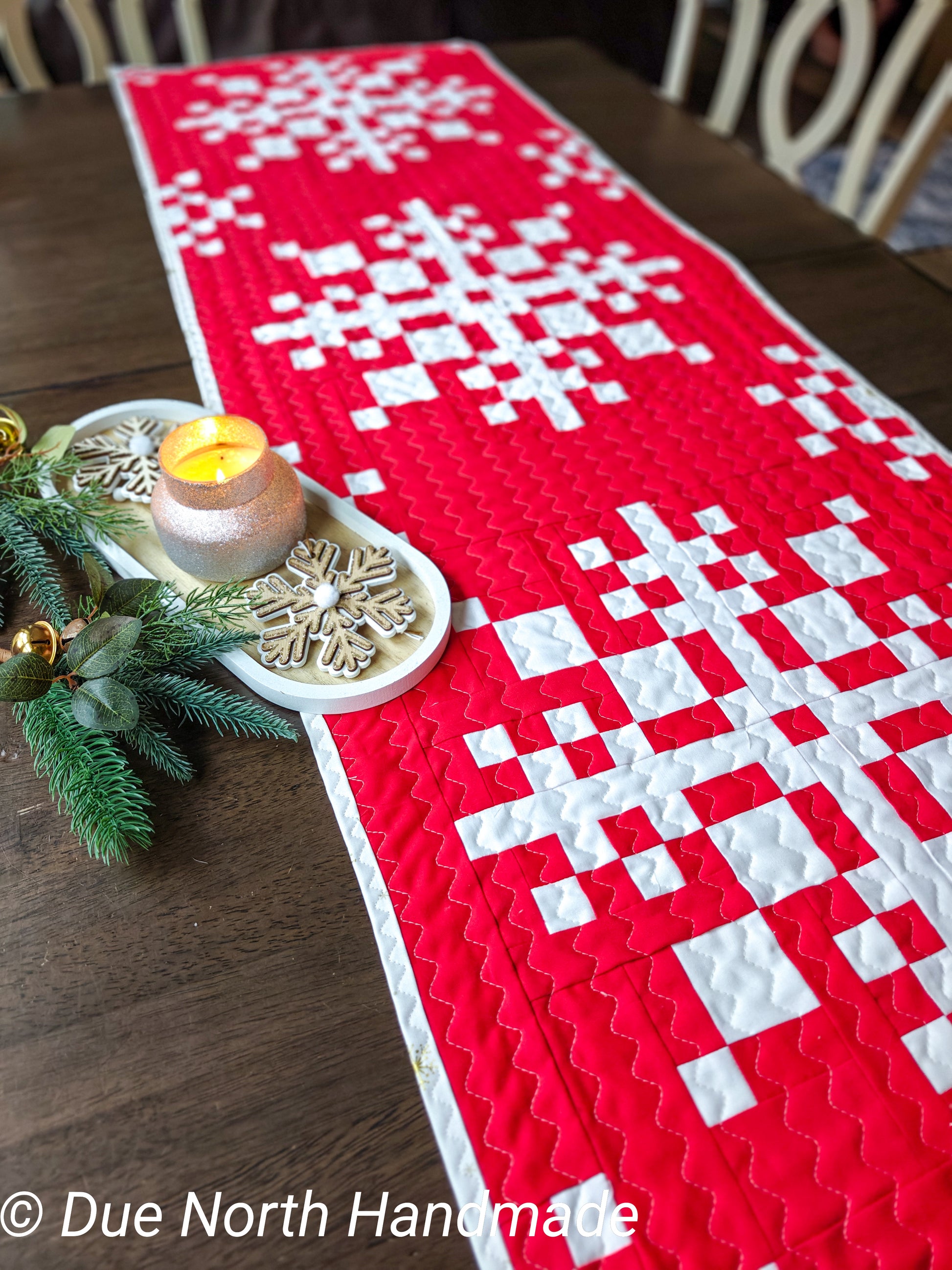 "Add a touch of holiday charm to your dining table with our Snowglow table runner. This quilted runner, featuring a traditional red and white snowflake design, brings a modern feel to your home. Elevate your holiday gatherings with this festive and stylish addition!"