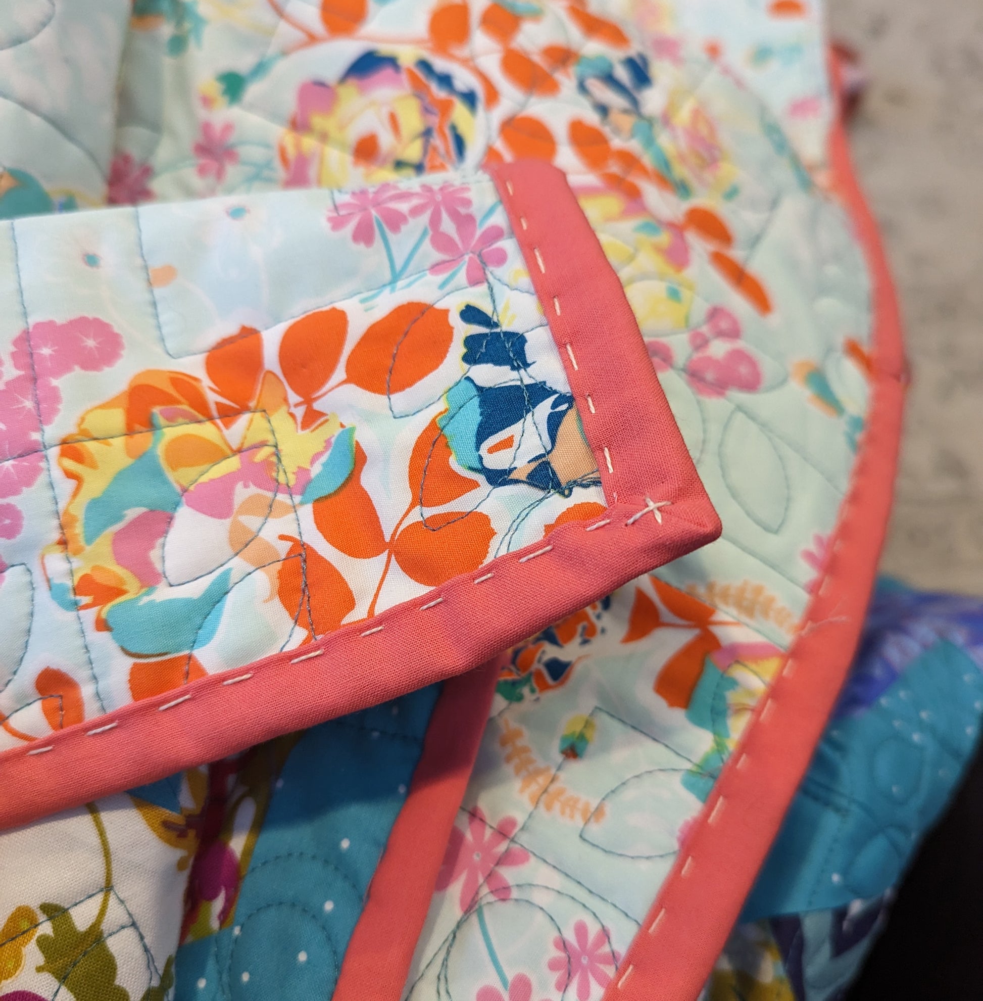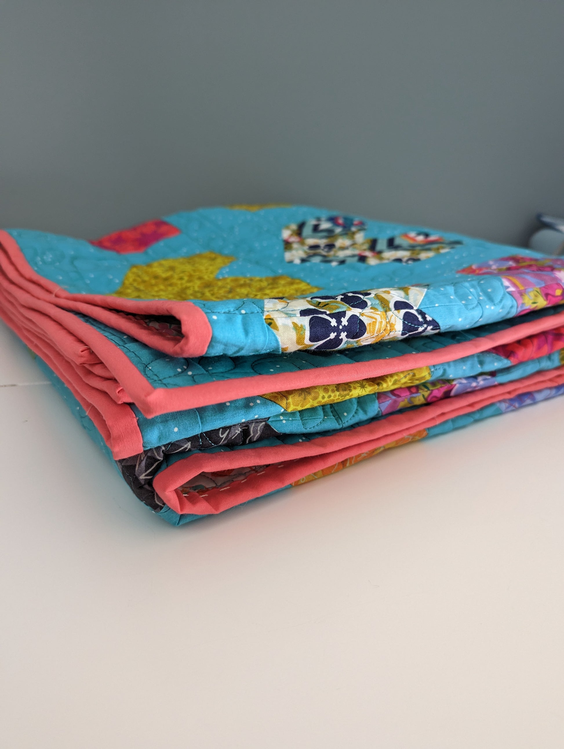This quilt features large bold printed fabrics with birds and floral and geometric motifs on a background of turquoise. It is professionally quilted with a modern flower pattern. This quilt.is fully machine washable and dryable.