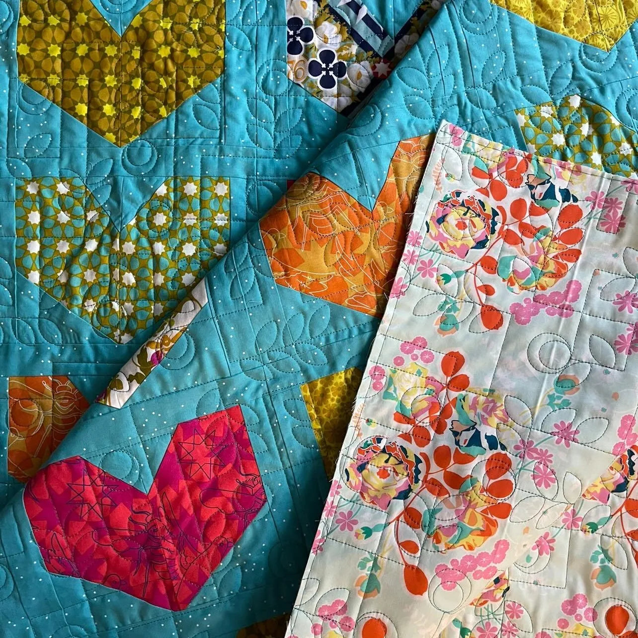 Bright and vibrant throw size quilt made from the Soho Hearts pattern by Ritual Quilt Company.