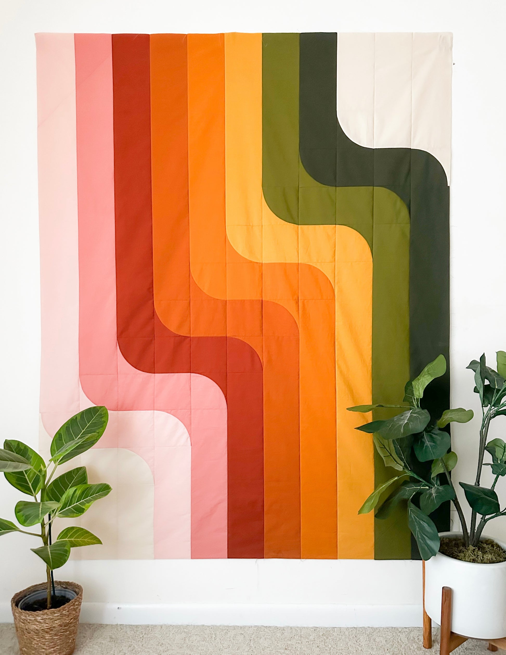 Waterfalls is a contemporary quilt design that uses simple squares and long rectangles with quarter circle curves to create the waterfall design.