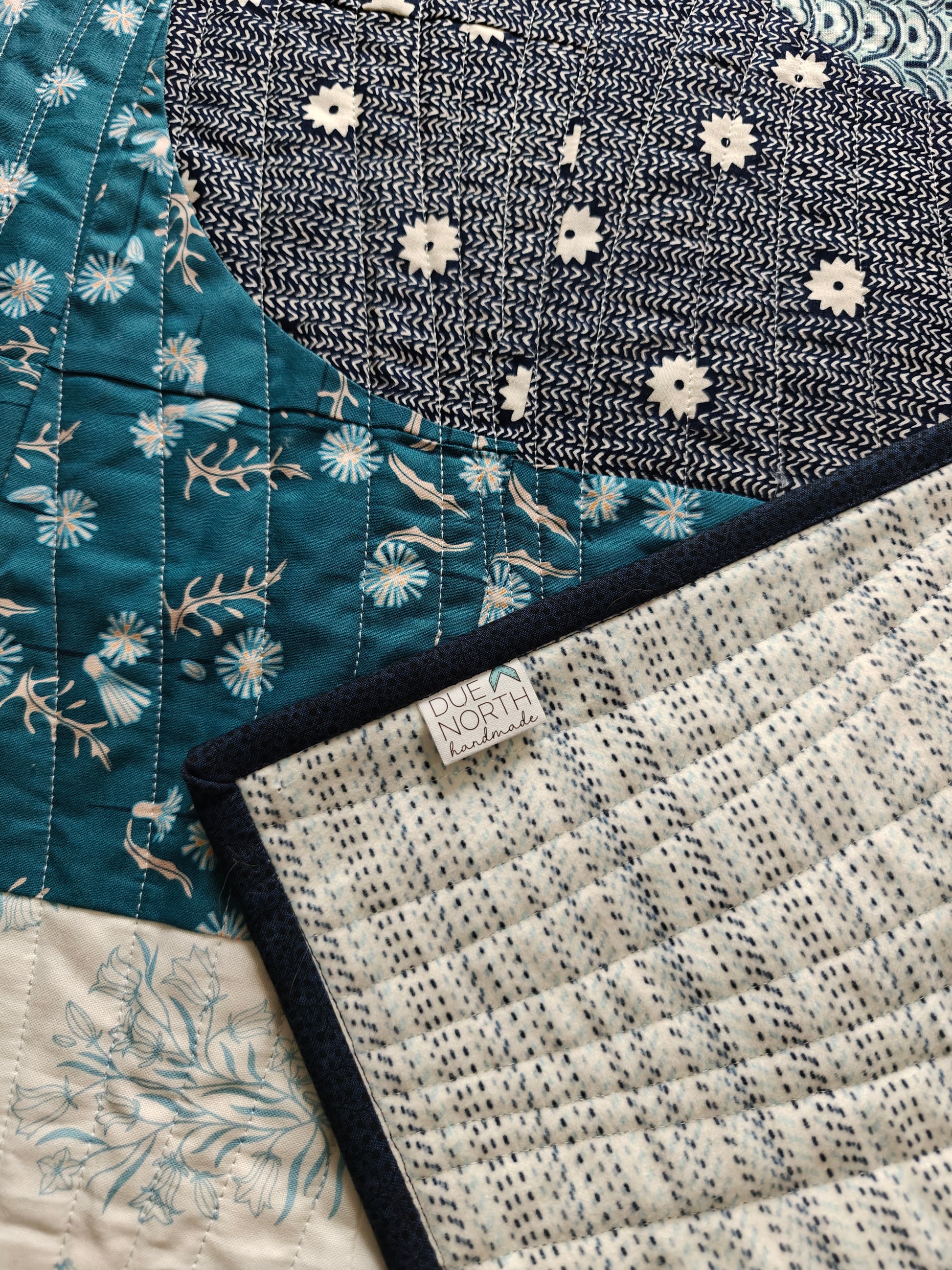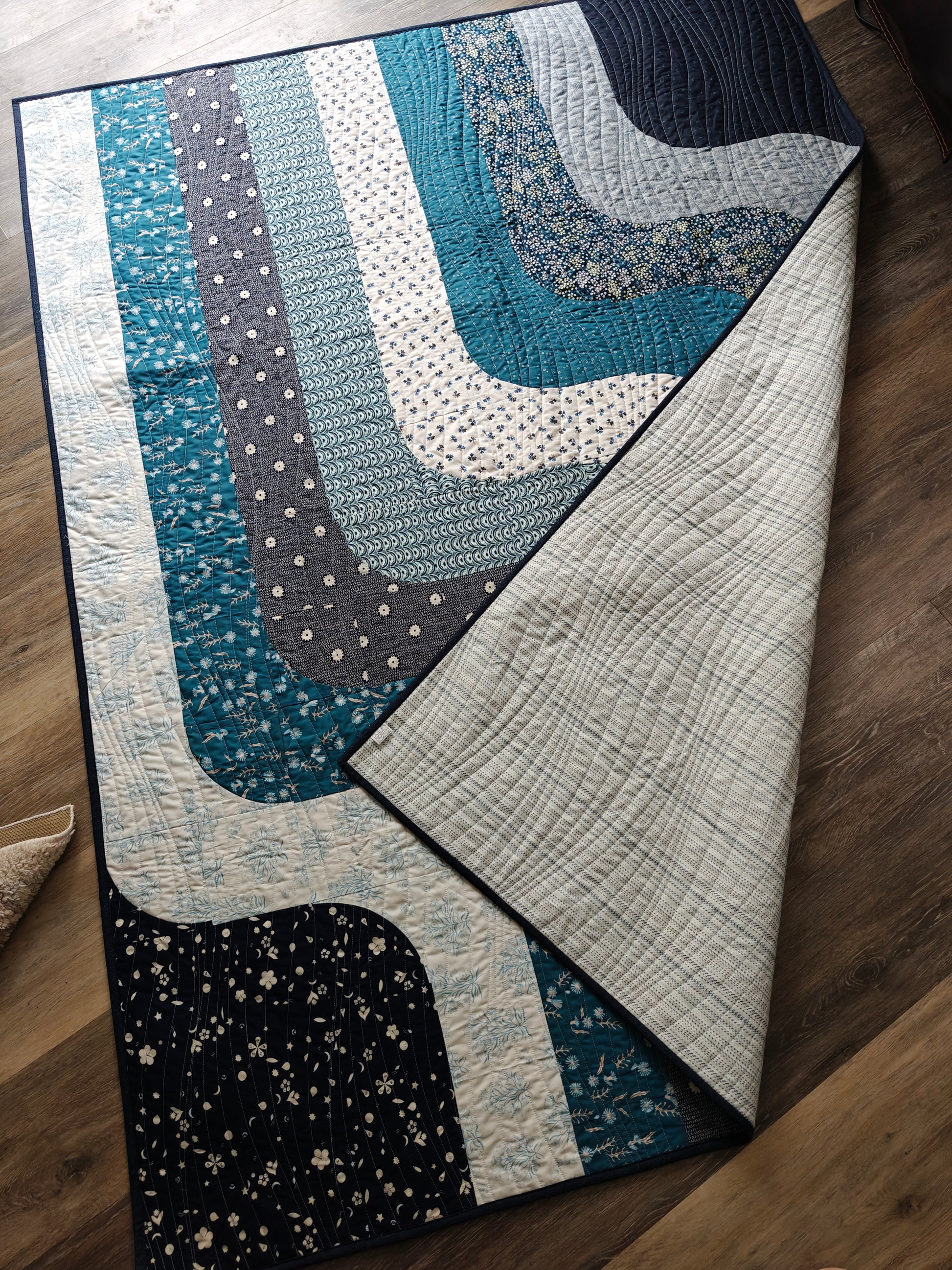 This throw size quilt, made using the Waterfalls pattern by Due North Handmade, is the perfect addition to any living space. Made from high quality, sustainably sourced materials and backed with a soft striped flannel, you're sure to feel wrapped up and cozy.