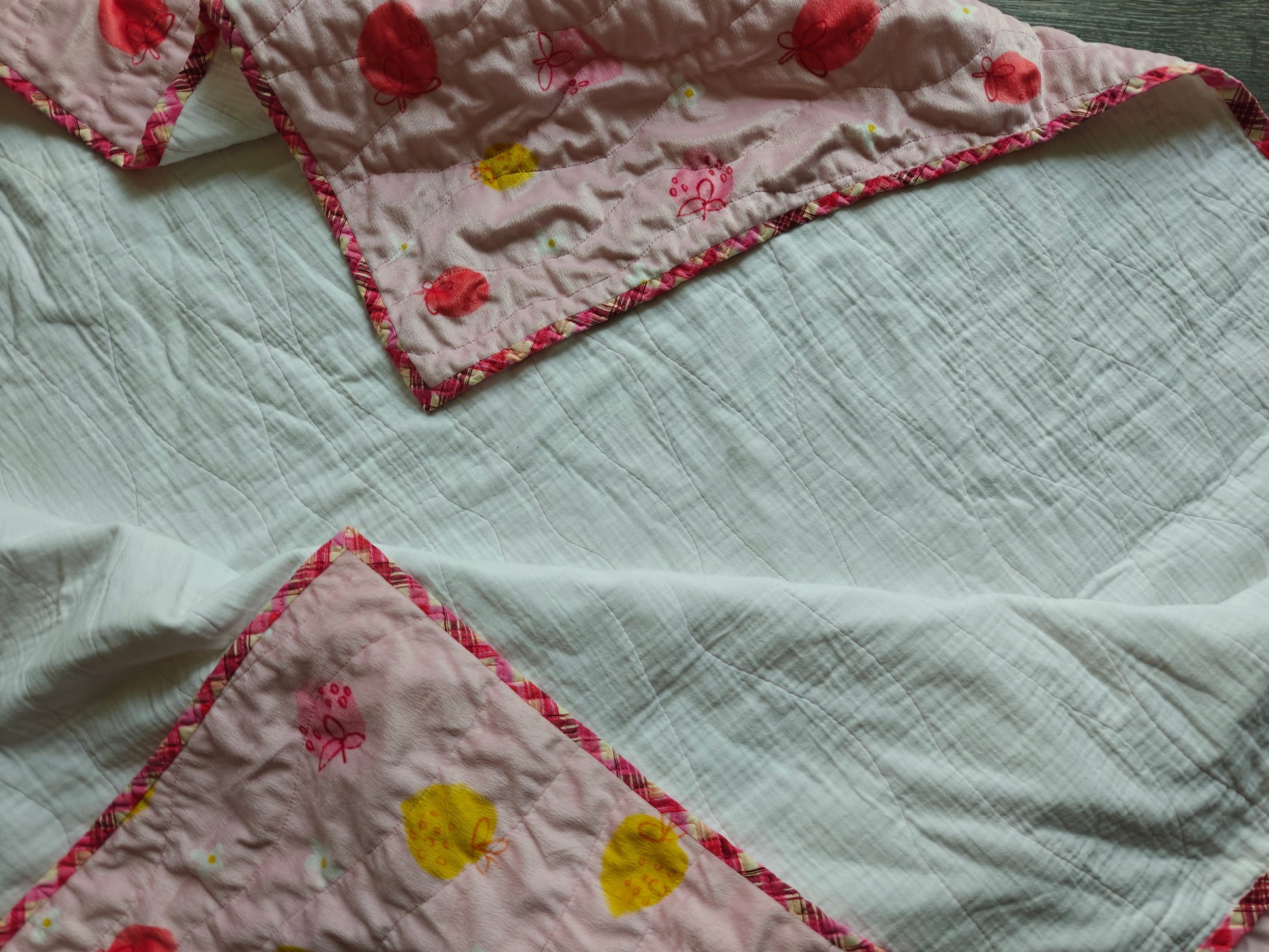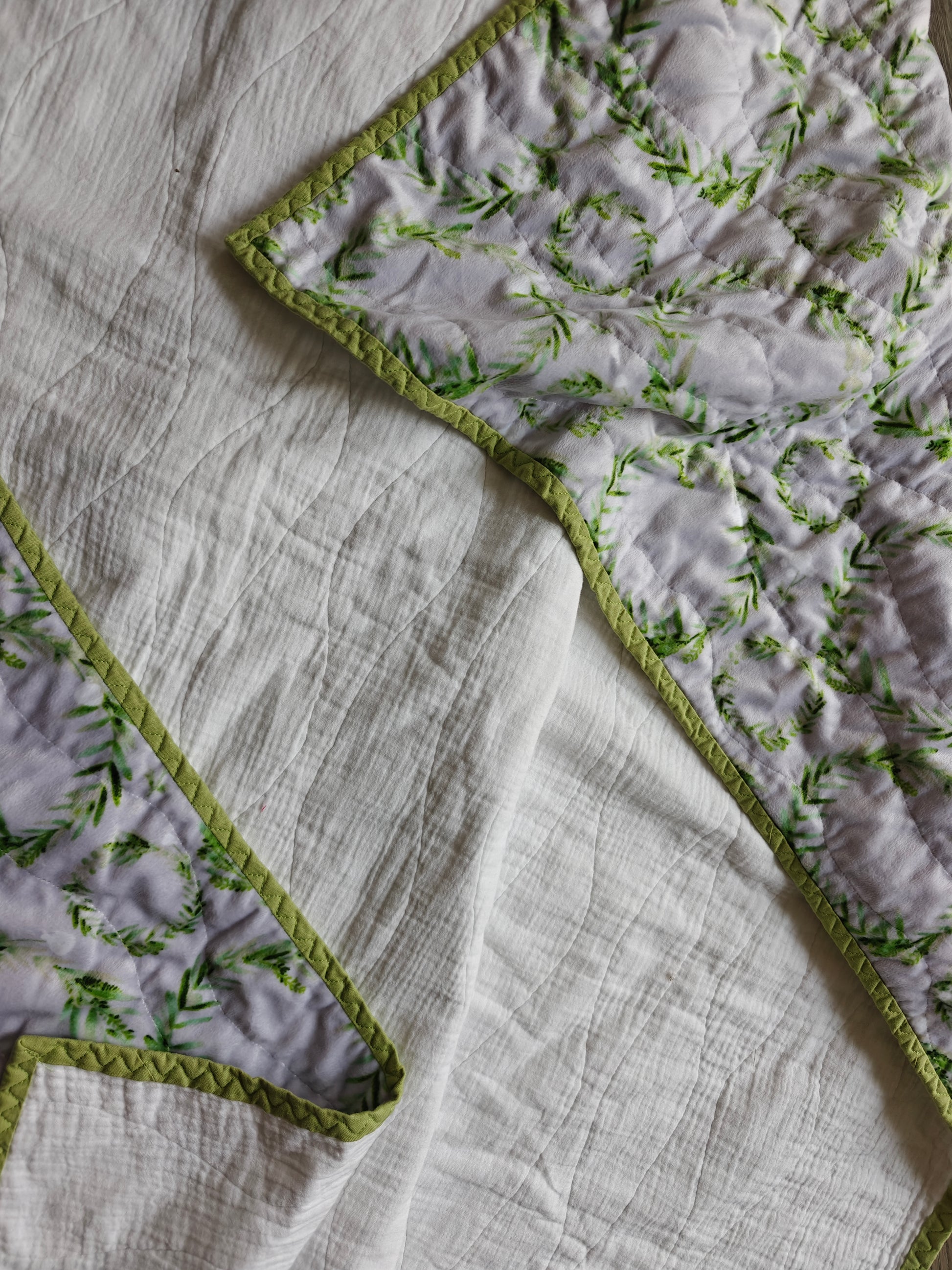 This whole cloth quilt combines the softness of minky and breathable double gauze with a cozy flannel batting, creating a blanket perfect for all ages. Measuring approximately 50" x 60", it offers warmth and comfort while becoming even softer with use and washing. Ideal for anyone who appreciates a gentle, inviting touch in their everyday comfort.