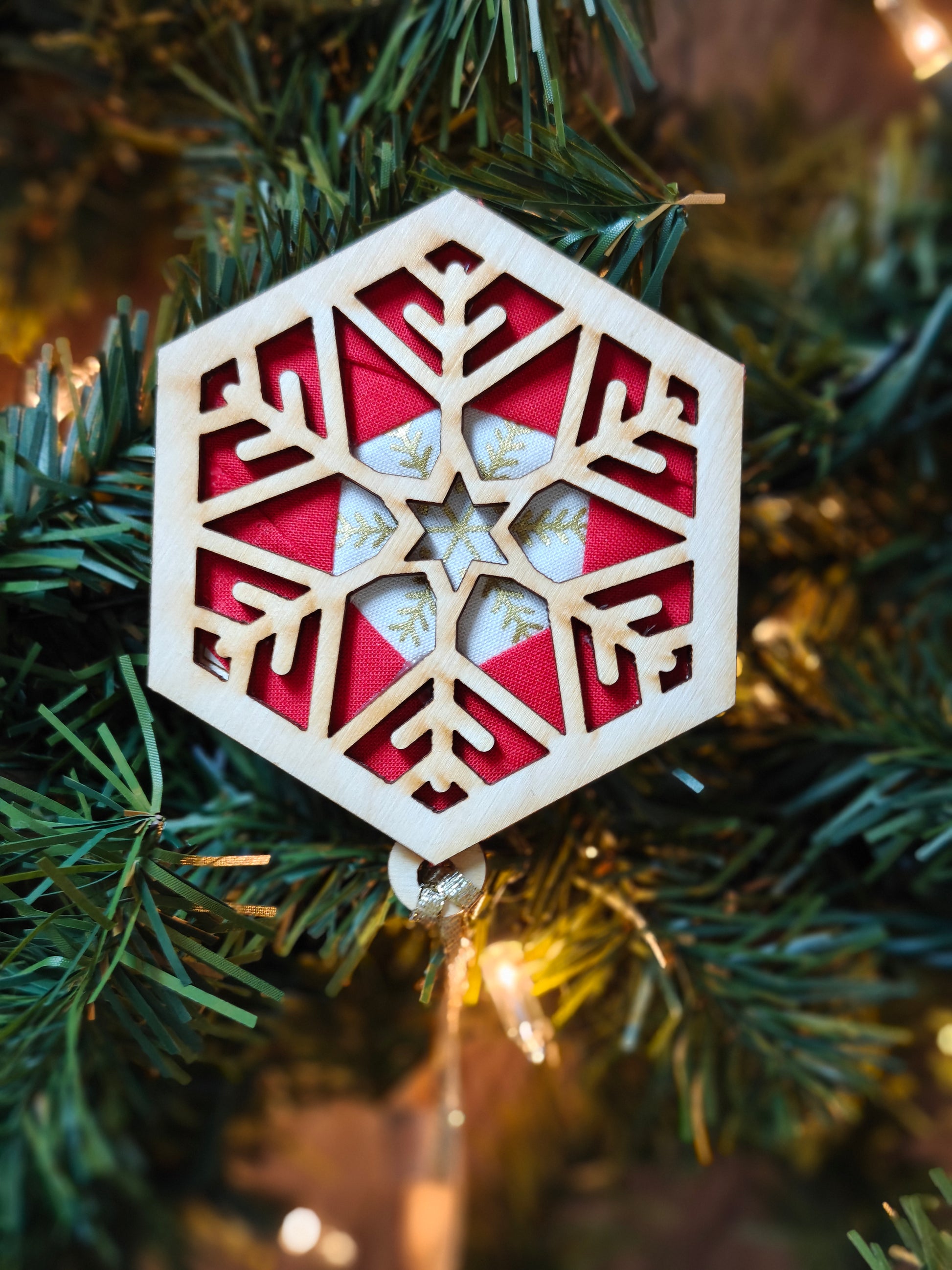 Quilt themed wooden ornament - showcases small quilts and fabric with a variety of designs